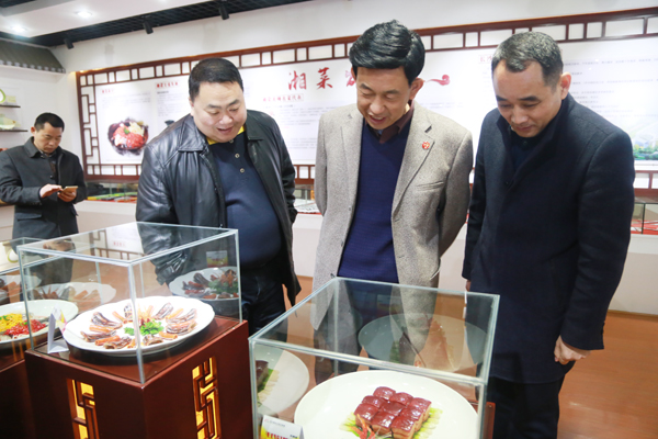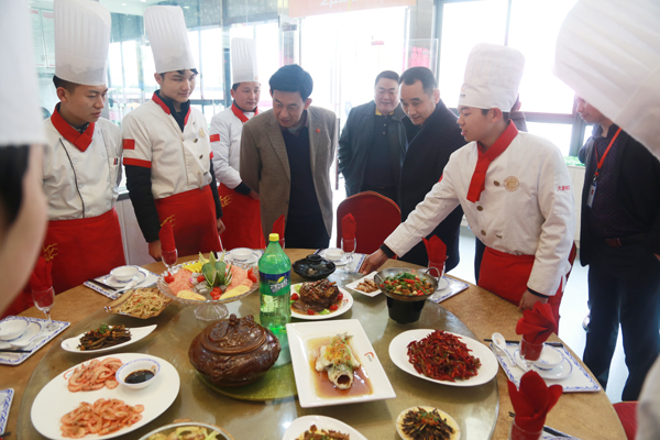 在参观过程中,同学们正在模拟酒店制作宴席,看了同学们的宴席,李厅长对学生们的烹饪水平给予了高度评价。随后又参观了校史馆,通过学院张院长的详细介绍,李厅长一行深入了解了长沙新东方的发展历程,并对校史馆里陈列的湘菜面塑赞不绝口。之后,李厅长们又参观了教学楼、学院展台,进一步了解了学院师资状况、专业开设及硬件设施情况等。