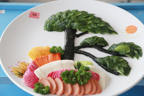 上午,实训大厅内,烹饪精英1504班的学生已经在为冷拼阶段考核做准备了。冷拼也称花色冷盘、花色拼盘、工艺冷拼等,是指利用各种加工好的冷菜原料,采用不同的刀法和拼摆技法,按照一定的次序层次和位置,将冷菜原料拼摆成山水、花卉、鸟类、动物等图案,提供给就餐者欣赏和食用的一门冷菜拼摆艺术。黄瓜、胡萝卜、白萝卜、南瓜等,经过学生们的巧手,各自发挥优势,取长补短,认真细致地完成了自己的考核作品。在最后的成果展现上,作品纷纷获得评委们的一致好评!
