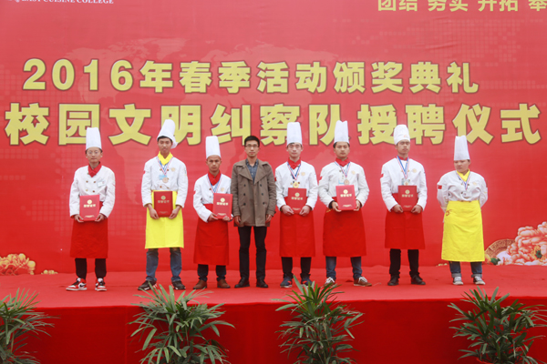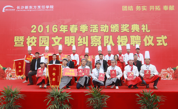 4月7日,长沙新东方烹饪学院2016年春季活动颁奖典礼暨校园文明纠察队受聘仪式圆满完成。学院徐助理、校区李主任以及其他各部门领导均出席了本次颁奖典礼,为在比赛中脱颖而出的同学们颁发了荣誉证书。